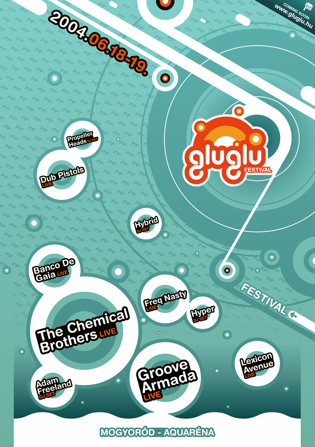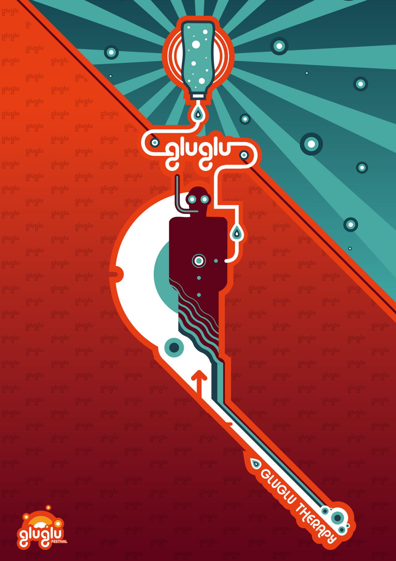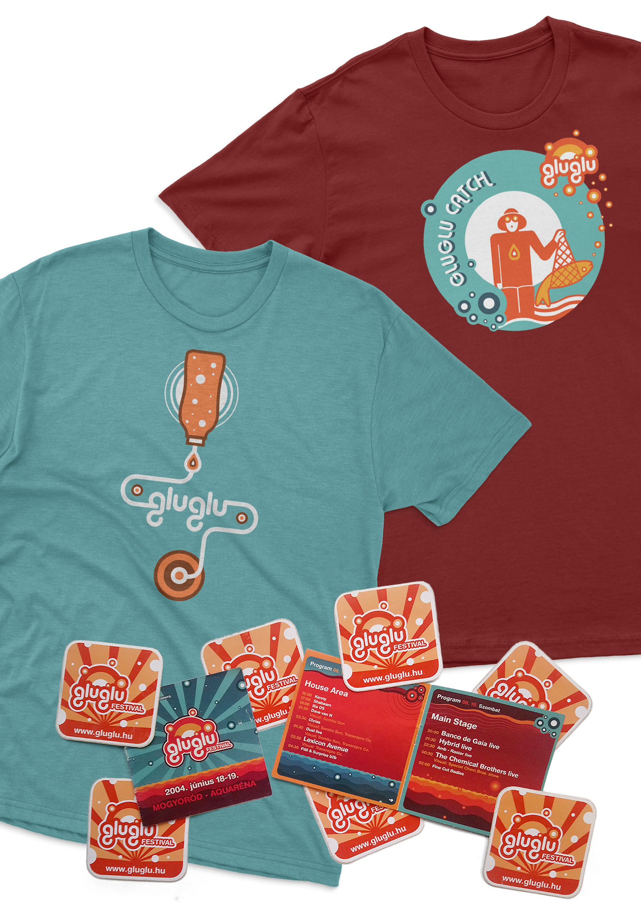 The GluGlu was an electronic music festival featuring world stars, held at the Aquarena in Hungary. A unique combination of bubbles, funny characters, and clean vector graphics.
